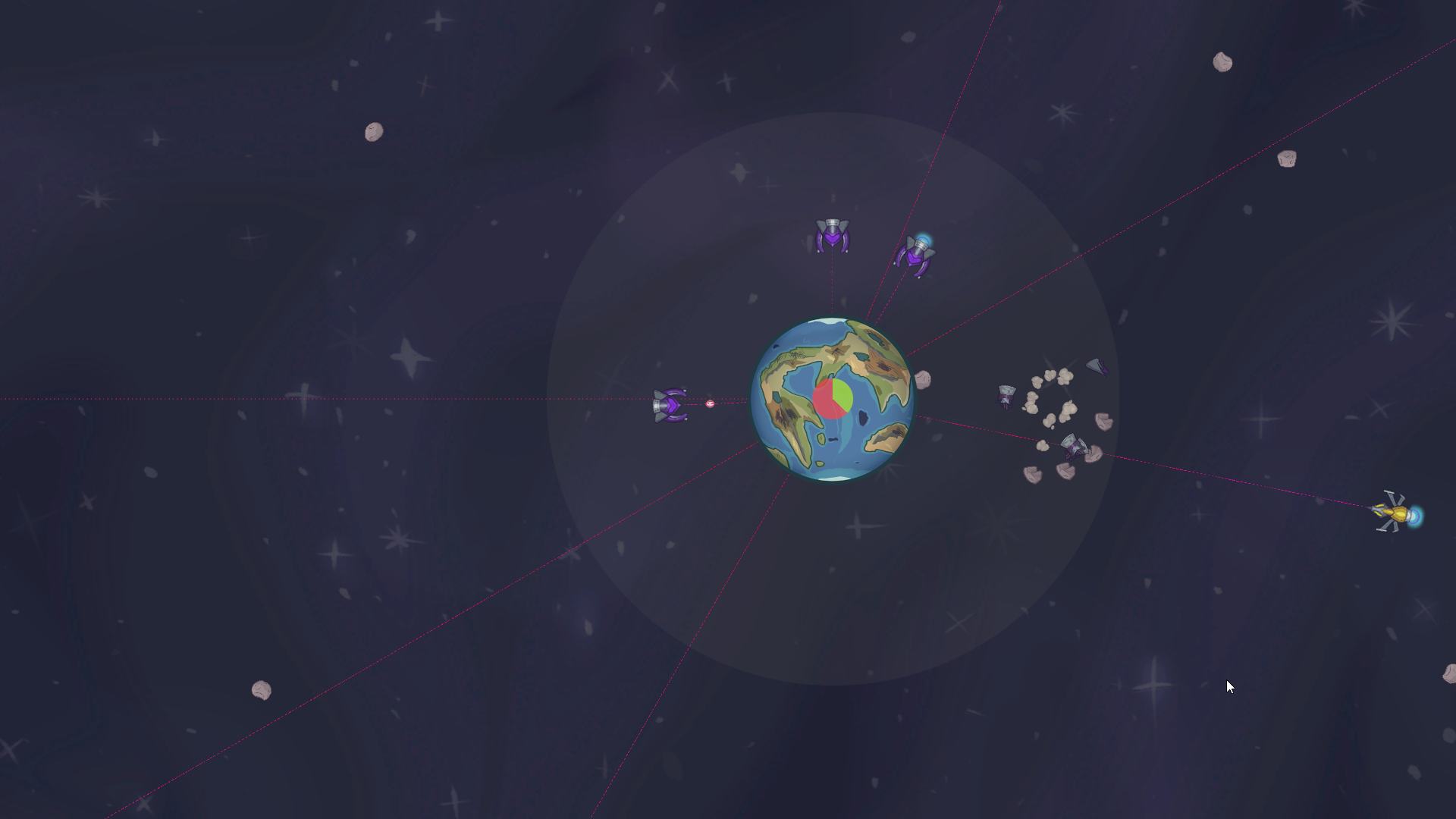 The planet is being attacked by alien ships! Use the asteroids in the surroundings as a shield to destroy the ships and save the planet. The more asteroids in orbit, the safest.